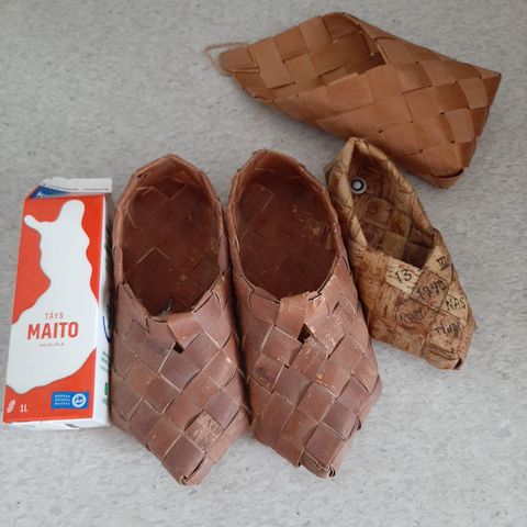Vanhat koivun tuohijalkineet 1970-luvulta. Tuohivirsut.