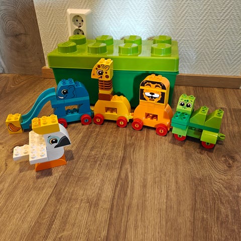 Ensimmäiset eläimeni -palikkarasia setti plus lisää osia. Lego Duplo palikat + säilytyslaatikko.