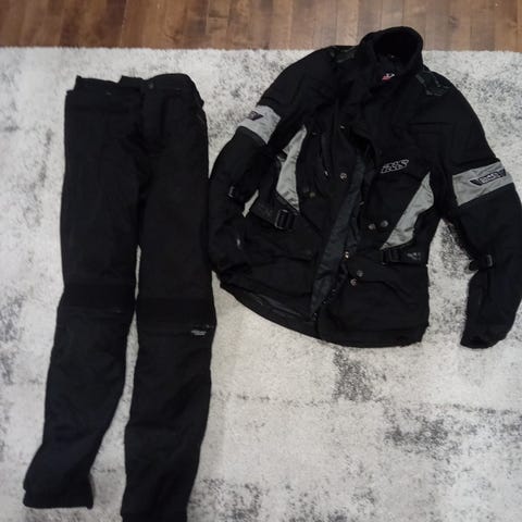 Hyväkuntoinen. Kaikki suojat paikallaan. Irroitettava erillinen vuori sekä housuissa että takissa.
