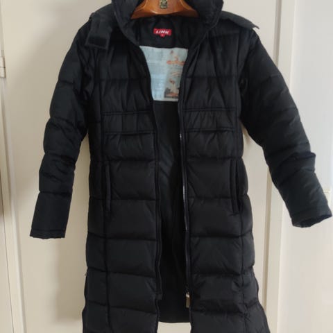 Musta Levis merkkinen untuvatakki. Lämmin ja uudenveroinen. Koko reilu s. Menee myös m-kokoa käyttävälle.