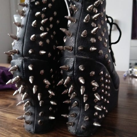 Demonia kengät. Hyvässä kunnossa, lukuunottamatta toisen kengän vetoketjua joka on värjäytynyt. Toisessa kengän sisäreunassa myös vähän kulumaa.