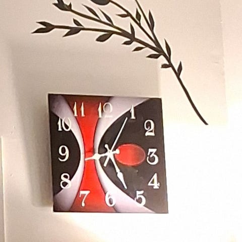 Kuvanmukainen seinäkello. Viisarit hieman vääntyneet. Paristo ei kuulu kauppaan. Halkaisija n. 36 cm.