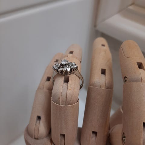 18k valkokultainen puoliallianssi sormus, jossa 15 timanttia. Koko n. 15,5-16.