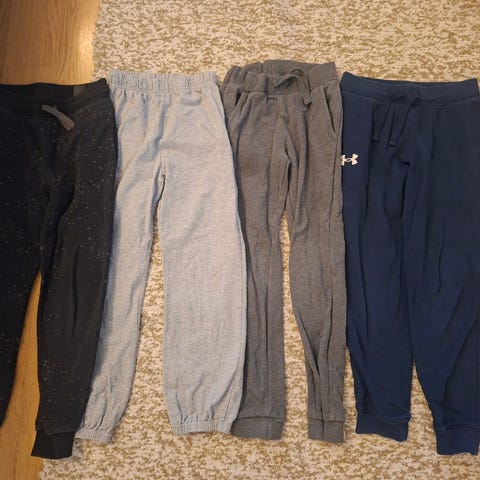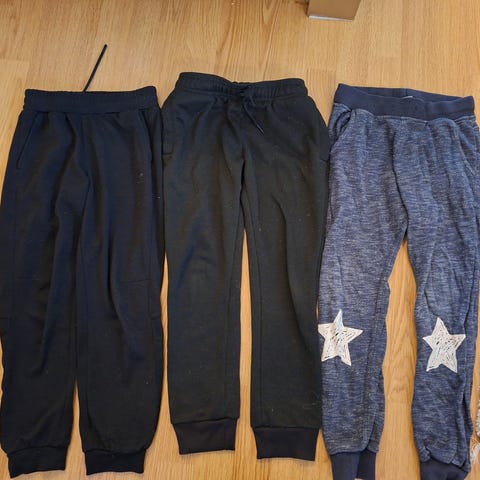 Kokomerkinnät vaihtelee, olleet käytössä n 122/128 koossa. Mustat kaikot, siistit, ehjät, tahrattomat. Keskellä keltaiset Zarat kaupan päälle. Polvissa jo enemmän kulumaa. Siniset Lindex, hieman kulumaa jo polvissa. HP. Yht. 6e.