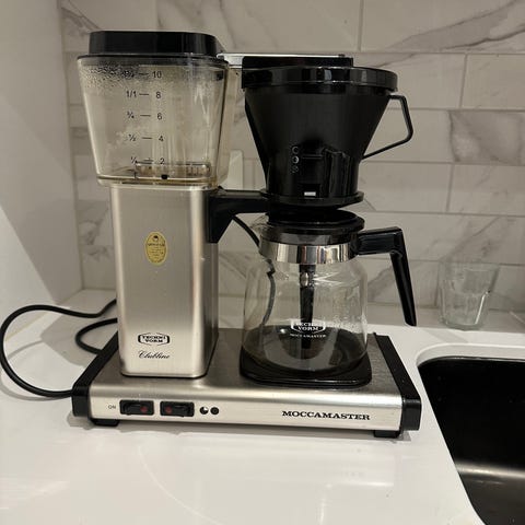 Myydään ehjä musta Moccamaster-kahvinkeittimen suodatinsuppilo automaattitippalukolla.
