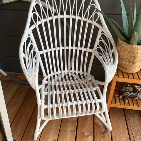 Ostan hyväkuntoisen luonnonvärisen Parolan rottingin Lumikenkä sohvan läheltä Lempäälää