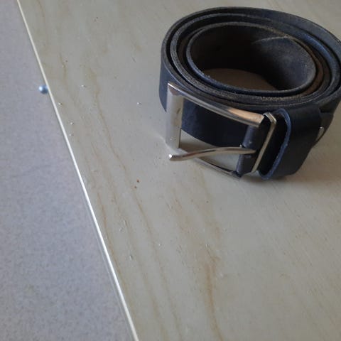 Musta Nini’s nahkavyö. Pituus 102 cm soljen kanssa, leveys 2,8 cm, solki 4 x 4 cm.