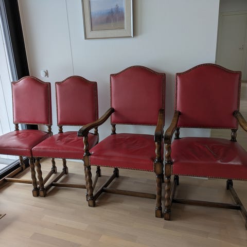 Hienossa kunnossa pidetyt Ruolan tuolit 6kpl uuteen kotiin. Verhoilut puhtaat eikä ole hajuja. Rungot tukevia kaikissa ja puuosat erittäin hyvässä kunnossa. Istuinkorkeus 46 cm. Myydään settinä.
