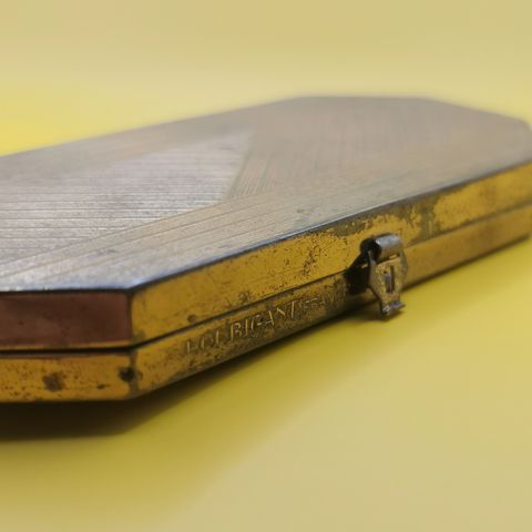 Vanha, ajan patinoima puuterirasia. Ehkä 1950-luvulta. Materiaalista en tiedä, hopea, alpakka tms metalli. Joku venäjänkielinen paikkakunnan nimi alareunassa. Puuterivippa sisällä. Peili halennut.