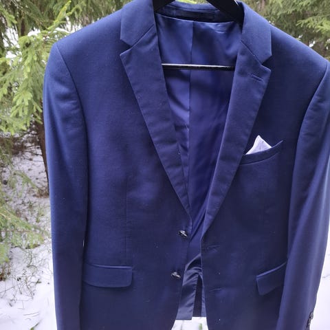 Pieneksi jäänyt puku ja paita myydään tarpeettomana. Sisäsaumaa avattu ja tarkistettu, ettei voi suurentaa. Tyylikäs kuosi. Sopii hoikalle 180 cm.