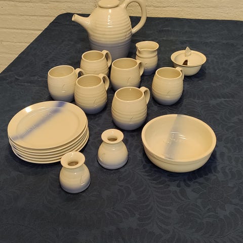 Raija Uosikkinen suunnittelemat Sokerikko, kermakko, tarjoilulautanen ja 4 pullalautasta.