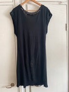 Myydään näyttävä musta mekko merkiltä Philosophy Blues Original. Etuosaa koristavat hopeiset niitit, jotka muodostavat kauniin kuvion. Hihansuissa tyylikkäät leikkaukset ja nyöritykset tuovat ilmettä.