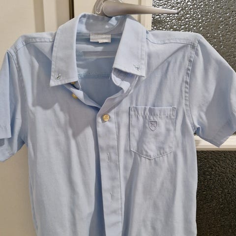 Valkoinen kauluspaita. Hihansuissa säätövara. Koko arviolta 98 cm, lappu leikattu pois.