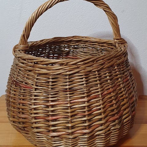 Noin 70 luvun Ompelukori. Materiaali muovi punosrottinki ei siis rottinkia. Oranssisessa välikansi lokerikossa useampi halkeama mutta toimiva edelleen. Korissa olevan kankaan ratkeamat peitetty nauhalla 2 kpl jotka ilman liimaa pysyvät kuitenkin jokseenkin paikoillaan.