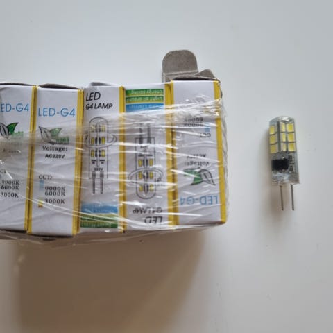 2 käyttämätöntä LED G4-kantaista himmennettävää polttimoa 1,1 W, 2700 K. Yhteensä 2€.
