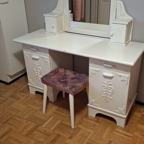 Talonpoikaisrokokoo tyylinen kampauspöytä ja rahi. Rahi päällystetty. Alkuperäinen kangas alla ja vaatii entistyksen/puhdistuksen. Peilin korkeus pidikkeen kanssa 88cm.