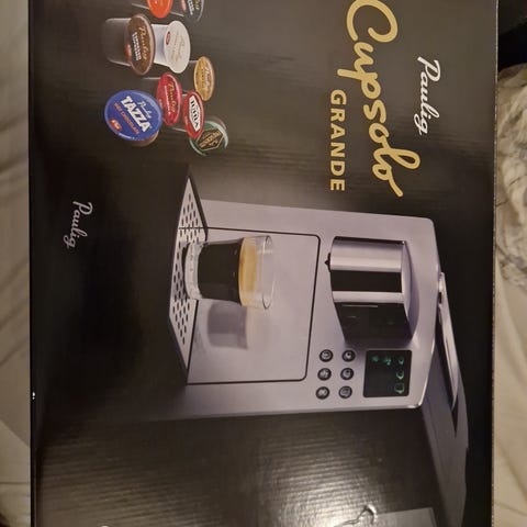 Toimiva Paulig Cupsolo ja teline. Ollut käyttämättömänä nyt parivuotta. Olisin iloinen jos joku sen ostaisi koska tarvitsen tilaa kaappiini, hinnasta en tingi.