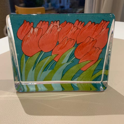 Iittalan tulppaanilasikoriste, kaunis, hyvä kunto, 14 x 11 cm, design Heljä Liukko-Sundström.