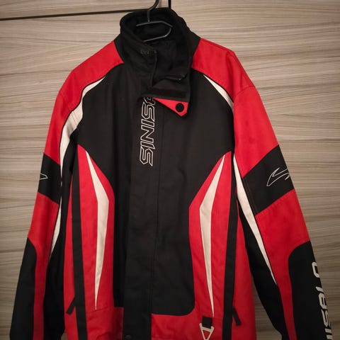 Sinisalo merkkinen puna-musta moottoripyörätakki. Sopii pienehkölle miehelle tai naiselle S- M koko.