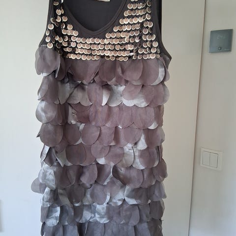 Lontoolainen Closet-merkkinen juhlamekko. Kai-kai 53 cm. Niska-helma 85 cm. Kauluksessa pari pientä laskosta. Pohjaväri on mustansininen. Helma laskeutuu kauniin ilmavasti, mikä saa aikaan imartelevan vyötärölinjan. Sopii rintavallekin. Kullanvärinen vetoketju selkäpuolella ja pienet taskut sivusaumoissa. Koko 42/44, XL, 16. Materiaalitietoja ei mekosta löytynyt, mutta omalta tuntumalta sanoisin tämän olevan jämäkkää puuvillaa. Ei vuoria.