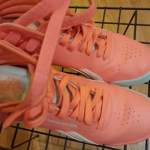 Pinkin Reebokin EasyTone lenkkarit koossa 38. Melko vähän käytetyt. Neulos on erittäin hyväkuntoinen. Irrotettavat sisäpohjalliset. Pohjassa värjäymää, kuten myös kengän etuosassa (mahdollisesti poistettavissa esim. ihmesienellä). Kengät pesty hellävaroen ennen myyntiä.