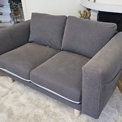 sohva punainen keltainen terassi piha puutarha Ikea mökki