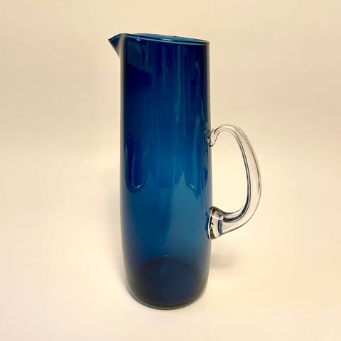 Tapio Wirkkalan Iittalalle suunnittelema sininen kulho tai malja. Puhallettua, happokäsiteltyä lasia, hopeinen jalusta, leimassa 813H P7.