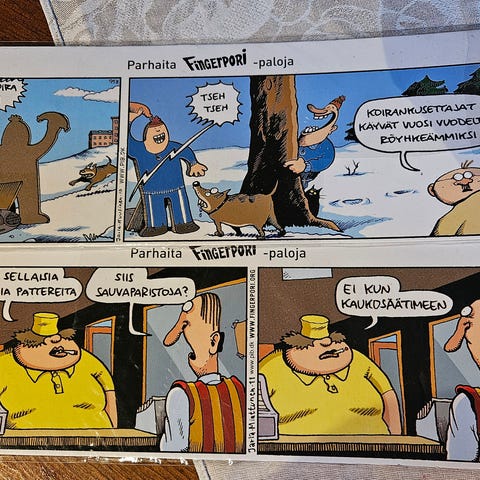 Myydään pahviset Fingerpori -huumorikortit, uudet ja muovipaketeissa valmiiksi.