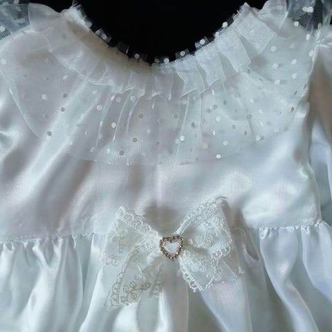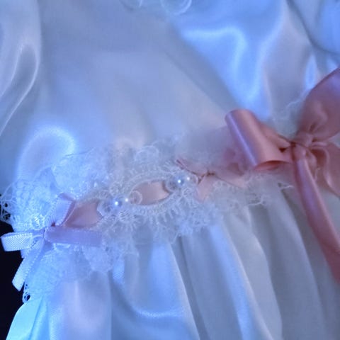 Den högkvalitativa, mjuka gräddvita satinen känns behaglig mot babyns hud och faller vackert. Söt prickig spets runt halsringningen ger klänningen en charmig detalj. Bandets färg kan du välja fritt i sista bilden.