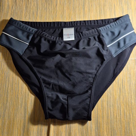 Miesten mustat Finnwear uikkarit koko S. Vetoketjullinen tasku.