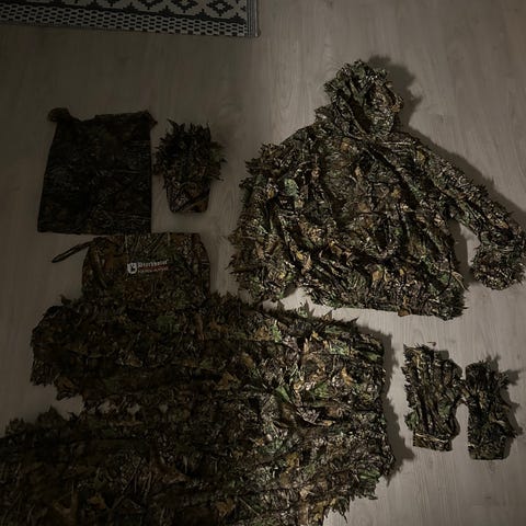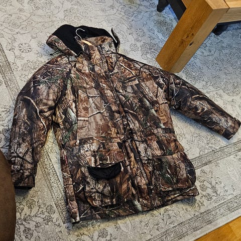 Maastokuvioitu(realtree camo) lippalakki, joka on käännettävissä oranssiksi safety capiksi, eli "hirvihatuksi".