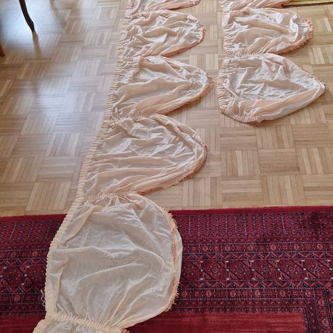 Anttilasta aikanaan ostettu ruusukuvioinen valmisverhokappa, jäänyt käyttämättä. Leveys 220cm, kokonaiskorkeus 57cm, harja 5cm. Tankokuja. Alareunassa vihreä polka dot -kangaskaitale + pitsinauhat.