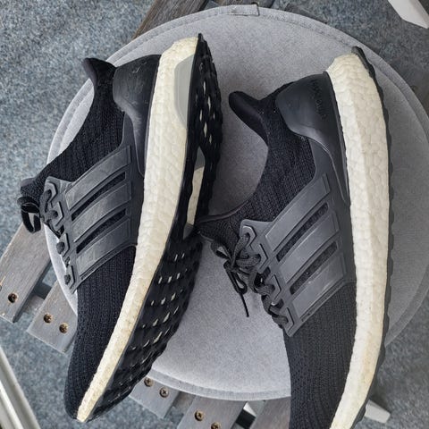 Kevyet, mukavat juoksukengät koko 43. Kuten kuvasta näkyy, hyvin siistit. Näitä ei juuri keretty kuin kokeilla, ennen kuin jäivät muksulta pieneksi.