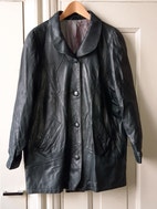 Hyväntuntuista, pehmeää, aitoa nahkaa. Ohut vuori. Nappikiinnitys. Pyöreäreunainen kaulus, olkapäillä rypytykset, pussihihat.