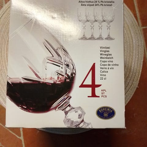 Bohemia kristalli viinilaseja 8kpl. Reunassa viinirypäle köynnös kuvio. Korkeus 16cm