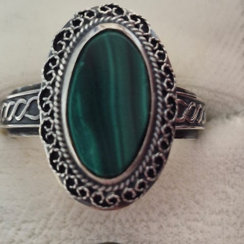 Suurikokoinen vanha hopea sormus isokokoisella mustalla kivellä, kivi hienosti leikattu. Hyvä kunto. Sormuksen runko erikoisen mallinen. Uskoisin kiven olevan onyx tai markasiitti.