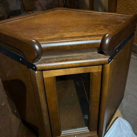 Väri tumma pähkinä. Nurkkaelementti yläsokkelilla. Nouto Katajanokalta. Kulkeutuu myös Alajärvelle tai Mikkeliin.