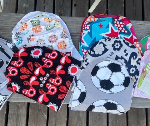 Kuvien mukaiset uudet käsityönä tehdyt pipot.Kaksinkertaista trikoota koot on merkitty kuvien yläkulmaan.Hinta 10€ / kpl +postikulut