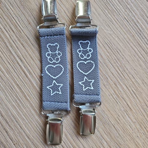 Kaksi erillistä mustaa kuminauhaa, joissa molemmissa päissä nipsut. Olisko lapaspidike oikea termi.