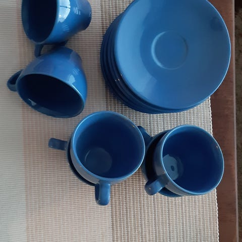 Siniset kupit tarpeettomana uuteen kotiin. Kahvikuppeja 6 kpl ja teekuppeja 4 kpl.