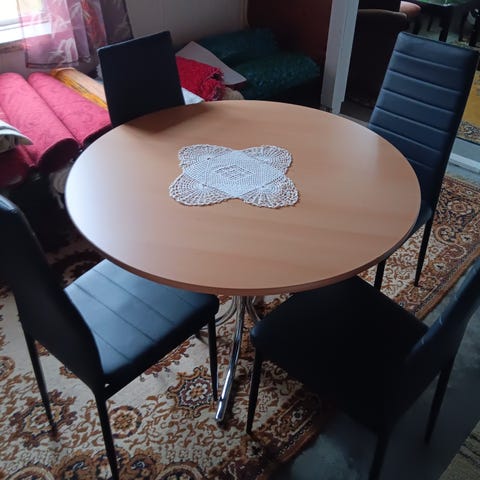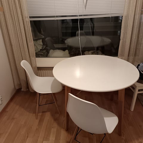 Pöytä levy paksua ja painavaa puuta sekä tuolit jämäkät.
