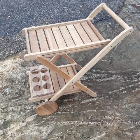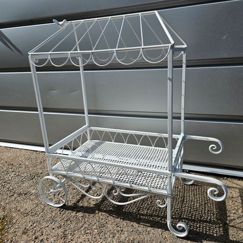 Valkoinen puinen tarjoiluvaunu. Tukeva. Isot renkaat, helppo siirrellä.