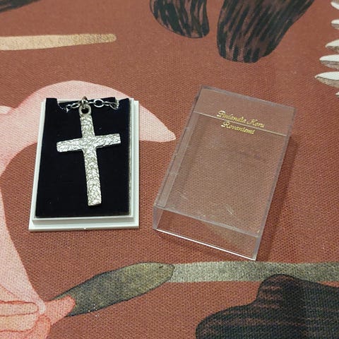 Keraaminen risti kaulakoru nahkanauhassa, nauhan pituus 29cm, riipuksen halkaisija 2,5cm,kulkee myös postin kautta kirjeenä