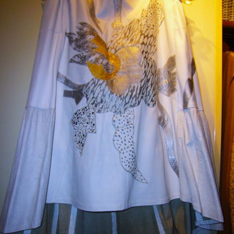 Täysin uusi, laput kiinni. Vyö kuuluu hameeseen, vetoketju sivulla, pehmeää "nahkaa", laskeutuu nätisti, hienot leikkaukset. Vyötärön ympärys on 84 cm ja joustaa jonkin verran, pituus on 84 cm.