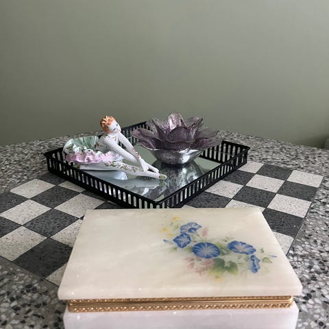 Korurasia, jossa on vihreä kivi kannessa ja hopeanvärinen koristeellinen reunus. Materiaali sisältänee metallia ja kiveä en siis tiedä materiaalia korkeus n.8cm ja paino reilu 700gr. Sopii pienten korujen säilytykseen. Taitaa olla vintage
