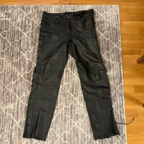 Moottoripyöräily nahkahousut L 40 koossa. Hyvässä kunnossa. Hyvin tuulen pitävät . Casual news merkki