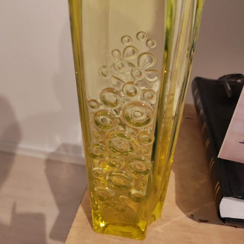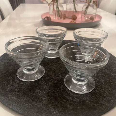 Bölgeblick kannu ja neljä lasia. Lasien pohjasta hiottu rengas pois, niissä ei ole mitään merkintää. Ne ovat hyvin vanhat, jälki on ikäänkuin rouheampi näissä astioissa, sisältävät ilmakuplia. Hinta 100 euroa yhteensä