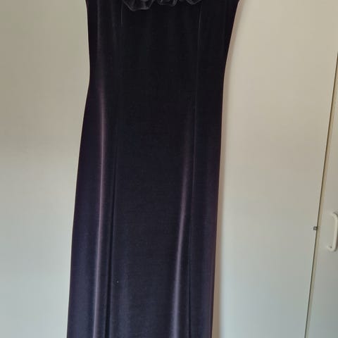 Musta samettimekko jossa yläosassa paljetteja. Laput kiinni. Yhdellä pistolla kiinni olleet olkatoppaukset irroitettu, mutta saa helposti takaisin, jos kaipaa.