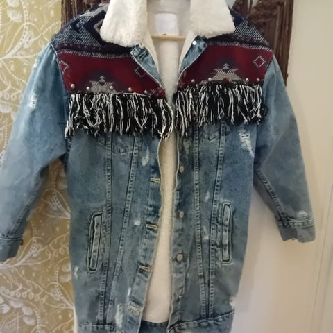 farkkutakki, jossa on huppu, rispaantuneet reunat ja nyörikiristys. Huppu on irrotettava. Takki on minulle liian iso. Se on täysin uusi.
