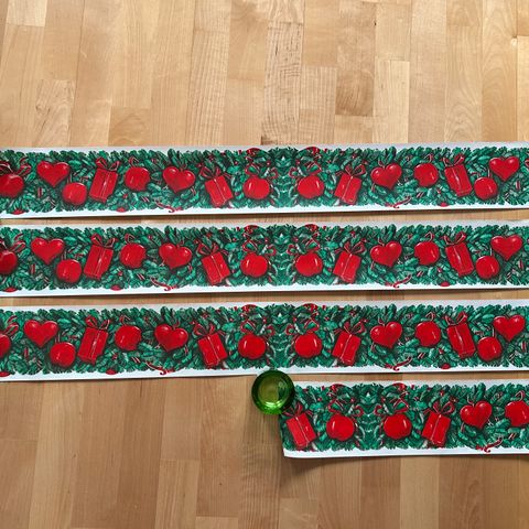 Vintage ikkunakoriste / boordi ( tarrallinen, yht. 3,9 metriä ) Boorbin leveys 11,5 cm. Pituudet : 2 x 98 cm, 1 x 63 cm, 1 x 66 cm ja 1 x 68 cm. Nämä ovat käyttämättömät, mutta teipin pitävyydestä ei varmuutta. Näitä ollut 70-luvulla kaupan ikkunan somisteena. Hinta yht. 15 €.